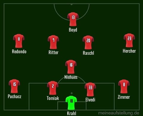 Krahl - Elvedi, Niehues, Tomiak - Zimmer, Raschl, Ritter, Puchacz - Hercher, Boyd, Redondo // Ersatzbank: Spahic, Durm, Zuck, Kraus, Klement, Hanslik, Zolinski, Tachie, Ache