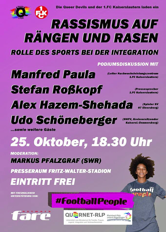 Unter dem Motto "Football Against Racism in Europe" (FARE) finden in verschiedenen europäischen Ländern Aktionen für Vielfalt im Fußball statt. Daran beteiligten sich Initiativen, Institutionen, Organisationen, Vereine und Fanclubs. In Kaiserslautern laden die "Queer Devils" in Zusammenarbeit mit dem 1. FC Kaiserslautern zu zwei Veranstaltungen im Rahmen der FARE-Aktionswochen ein.