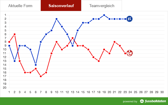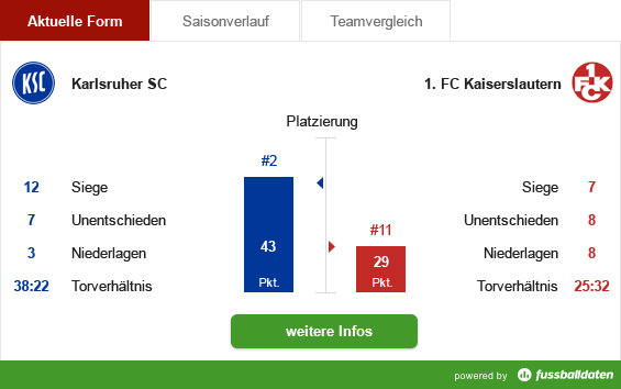 In der Tabelle trennen den KSC und FCK mittlerweile neun Plätze. Während Blau-Weiß in der Spitzengruppe steht, dümpelt der FCK im Mittelfeld herum. Übrigens: Nur dreimal (1., 2. und 13. Spieltag) standen die Roten Teufel vor den Karlsruhern, wie die nachfolgende Grafik von "Fussballdaten.de" veranschaulicht: