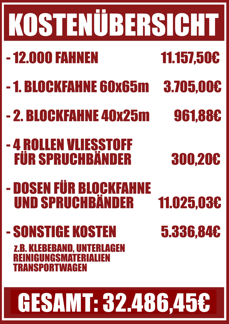 Die Derby-Choreo hat exakt 32.486,45 Euro gekostet - hunderte Arbeitsstunden der beteiligten Fans nicht mit eingerechnet - die sich wie folgt zusammensetzen: